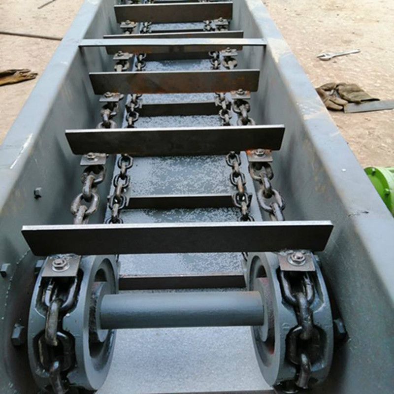 埋刮板輸送機是借助于在封閉的殼體內(nèi)運動著的刮板鏈條而使散體物料按預定目標輸送的運輸設(shè)備。它具有體積小、密封性強、剛性好、工藝布置靈活、安裝維修方便、并能多點加料和多點卸料等優(yōu)點。因此顯著改善了工人的勞動條件,防止了環(huán)境污染。埋刮板輸送機原理是依賴于物料所具有的內(nèi)摩擦力和殼體給物料的側(cè)壓力,在輸送物料過程中,刮板鏈條運動方向的壓力以及在不斷給料時下部物料對上部物料的推移力,這些作用力的合成足以克服物料在機槽中被輸送時與殼體之間產(chǎn)生的外摩擦阻力和物料自身的重量。使物料無論在水平輸送、傾斜輸送和垂直輸送時都能形成連續(xù)的料流向前移動。